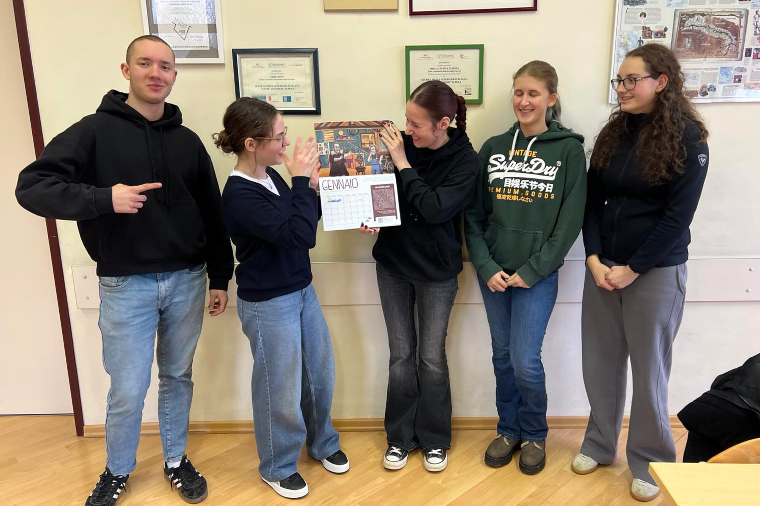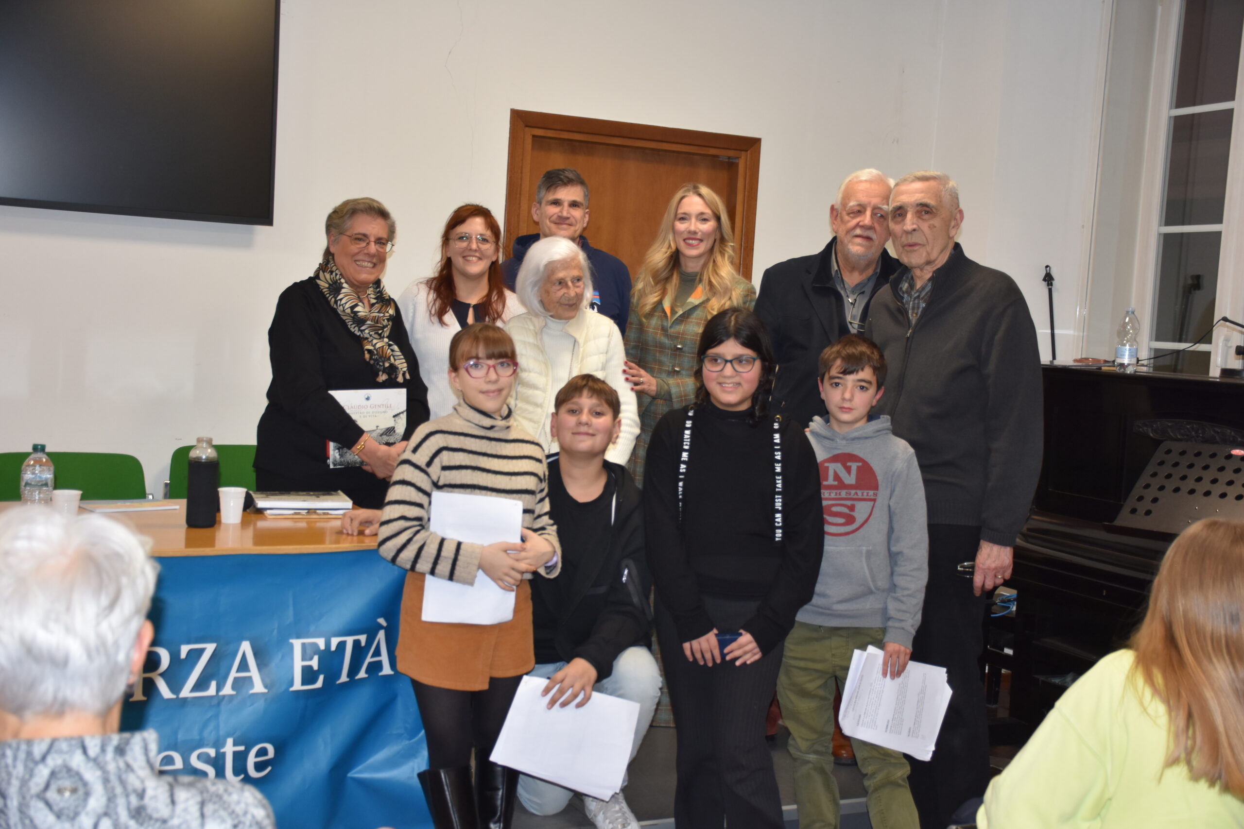 Alla presentazione, tenutasi il 12 dicembre 2025 a Trieste (in diretta streaming), intervengono il presidente dell'Università della Terza Età Lino Schepis, Maria Luisa Princivalli, la curatrice del calendario Laura Capuzzo e l'illustratrice Roberta Zucca, insieme ad alcuni studenti dell'Istituto comprensivo "Giancarlo Roli", con la loro insegnante di teatro Zita Fusco. Foto di Giorgio Susel.